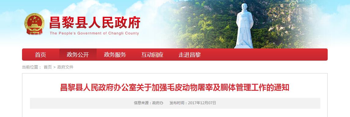 昌黎縣人民政府關(guān)于加強(qiáng)毛皮動物胴體管理工作的通 告 為進(jìn)一步加強(qiáng)毛皮動物胴體管理工作,確保我縣皮毛產(chǎn)業(yè)健康、穩(wěn)定發(fā)展,依據(jù)《中華人民共和國刑法》《中華人民共和國