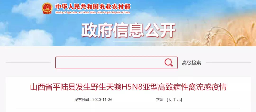 農(nóng)業(yè)農(nóng)村部新聞辦公室11月26日發(fā)布,山西省運(yùn)城市平陸縣發(fā)生野生天鵝H5N8亞型高致病性禽流感疫情?! ?1月26日,農(nóng)業(yè)農(nóng)村部接到中國(guó)動(dòng)物疫病預(yù)防控制中心報(bào)告,經(jīng)國(guó)