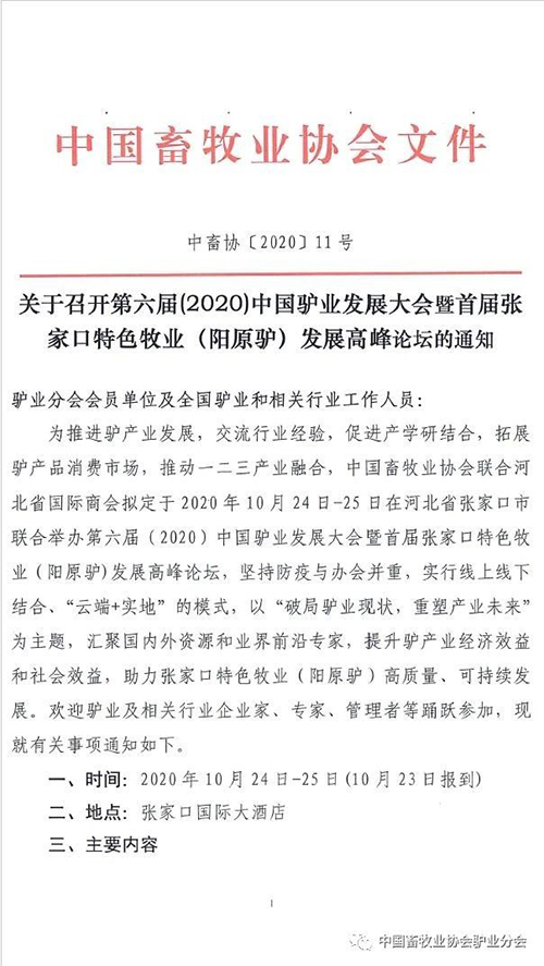 為推進驢產業(yè)發(fā)展,交流行業(yè)經驗,促進產學研結合,拓展驢產品消費市場,推動一二三產業(yè)融合,中國畜牧業(yè)協(xié)會聯(lián)合河北省國際商會擬定于2020年10月24日-25日在河北省張家口市聯(lián)合舉