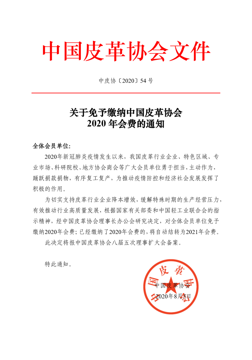 中國(guó)皮革協(xié)會(huì)文件中皮協(xié)[2020] 54號(hào)關(guān)于免予繳納中國(guó)皮革協(xié)會(huì)2020年會(huì)費(fèi)的通知全體會(huì)員單位:2020年新冠肺炎疫情發(fā)生以來,我國(guó)皮革行業(yè)企業(yè)、特色區(qū)域、專業(yè)市場(chǎng)、科研院校、