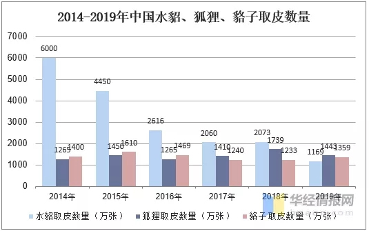 通常應(yīng)用的毛皮有羊、兔、狗等,比較名貴的有狐貍、貉子、水貂毛皮等,常用做大衣、帽子、圍巾的材料,比較厚重的毛皮如熊、狼的毛皮一般作為褥子、掛毯等材料。2019年中國(guó)水貂、狐貍、貉子取皮數(shù)量分別為1169萬張、1443萬張、1359萬張。