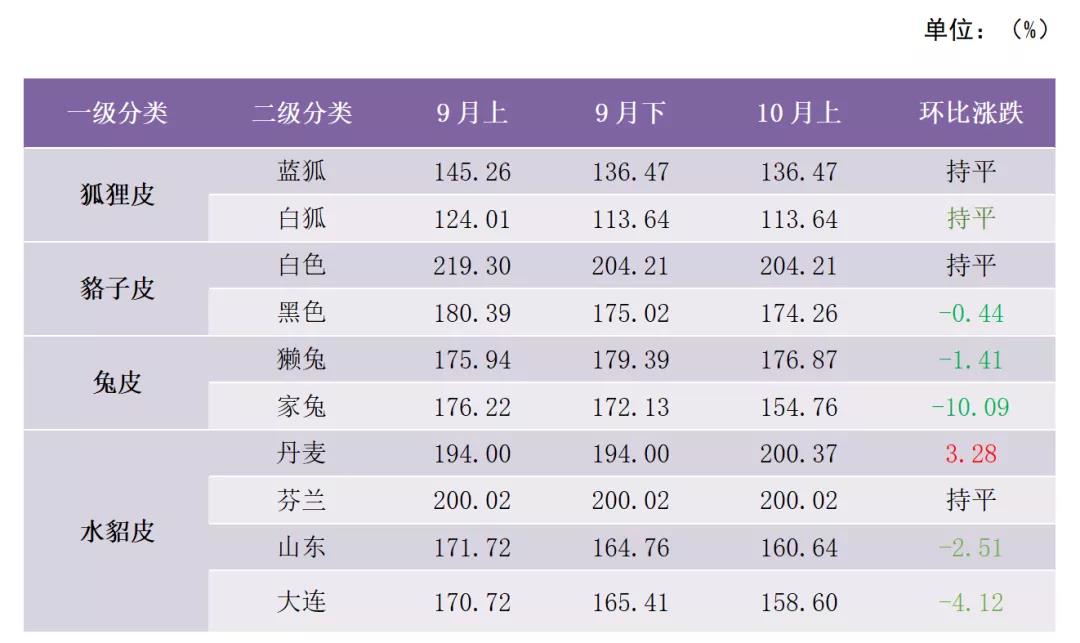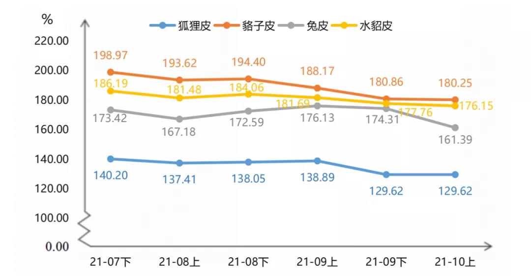 裘皮各品類產(chǎn)品價(jià)格指數(shù)中,兔皮產(chǎn)品價(jià)格指數(shù)下跌幅度較大,10月上半月價(jià)格指數(shù)收?qǐng)?bào)161.39點(diǎn),環(huán)比跌幅為7.41%。貉子皮和水貂皮產(chǎn)品價(jià)格10月上半月均有小幅走低,價(jià)格指數(shù)分別收?qǐng)?bào)180.25點(diǎn)和176.15點(diǎn),環(huán)比分別下滑0.34%和0.91%。10月上半月狐貍皮產(chǎn)品價(jià)格指數(shù)與上期持平,收?qǐng)?bào)129.62點(diǎn)。