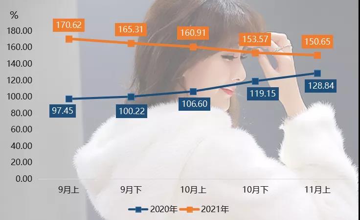 11月上半月,裘皮產(chǎn)品價(jià)格總指數(shù)收?qǐng)?bào)150.65點(diǎn),環(huán)比下滑1.90%。整體來看,裘皮價(jià)格指數(shù)與去年同期呈反向趨同運(yùn)行態(tài)勢(shì),11月上半月相比去年同期的128.84點(diǎn)仍處于較高水平。分析來看,下游服裝產(chǎn)品銷售不暢仍是裘皮產(chǎn)品價(jià)格下滑的根本原因。未來隨著氣溫下降,下游產(chǎn)品需求增加,裘皮產(chǎn)品市場(chǎng)行情也將逐步好轉(zhuǎn)。