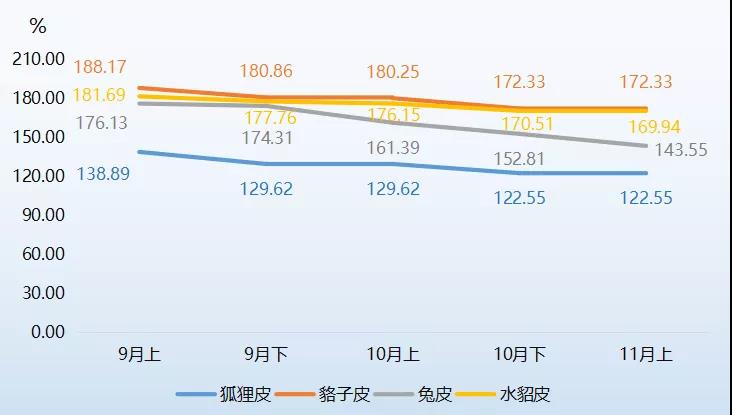 裘皮各品類產(chǎn)品價(jià)格指數(shù)中,兔皮和水貂皮產(chǎn)品價(jià)格指數(shù)均有所下滑,其中兔皮產(chǎn)品價(jià)格指數(shù)下跌幅度較大,11月上半月收?qǐng)?bào)143.55點(diǎn),環(huán)比跌幅為6.06%,是裘皮產(chǎn)品價(jià)格指數(shù)下滑的主要原因,導(dǎo)致裘皮產(chǎn)品價(jià)格指數(shù)下滑2.78個(gè)百分點(diǎn)。水貂皮產(chǎn)品價(jià)格指數(shù)11月上半月小幅下滑收?qǐng)?bào)169.94點(diǎn),跌幅為0.33%,環(huán)比跌幅有所收窄。狐貍皮和貉子皮產(chǎn)品價(jià)格指數(shù)運(yùn)行穩(wěn)定,11月上半月分別收?qǐng)?bào)122.55點(diǎn)和172.33點(diǎn),與上期持平,其中值得注意的是,貉子皮產(chǎn)品價(jià)格指數(shù)近期首次出現(xiàn)止跌態(tài)勢(shì),表明市場(chǎng)行情出現(xiàn)好轉(zhuǎn)跡象。