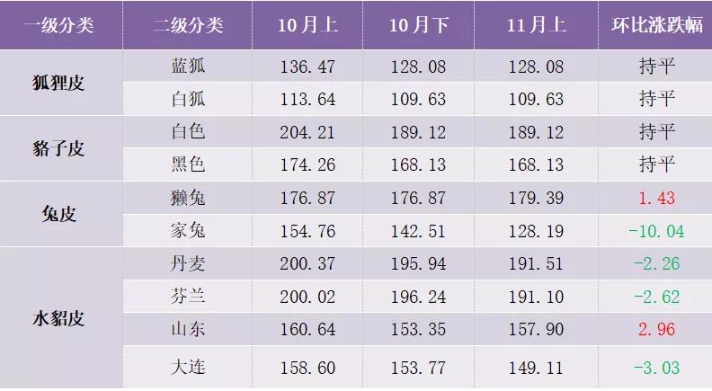 11月上半月,裘皮產(chǎn)品價(jià)格總指數(shù)呈現(xiàn)穩(wěn)中有降態(tài)勢(shì)