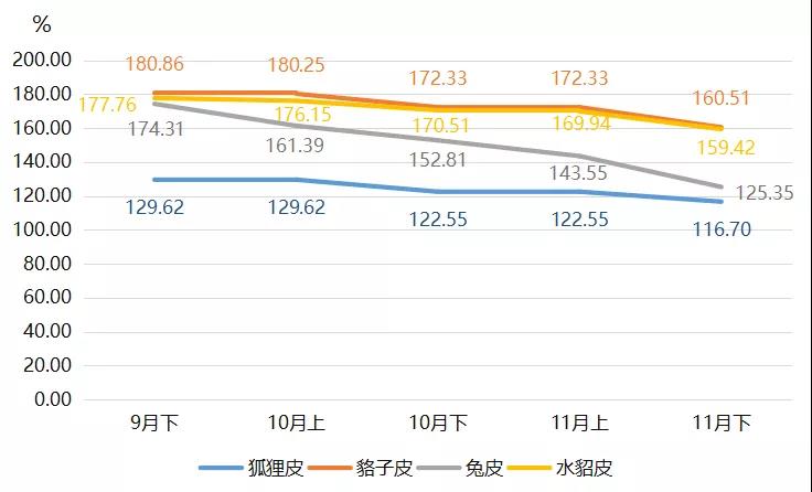 裘皮各品類(lèi)產(chǎn)品價(jià)格指數(shù)中,兔皮產(chǎn)品價(jià)格指數(shù)下跌幅度最大,11月下半月收?qǐng)?bào)125.35點(diǎn),環(huán)比跌幅為12.68%,是裘皮產(chǎn)品價(jià)格總指數(shù)下滑的主要原因,導(dǎo)致裘皮產(chǎn)品價(jià)格總指數(shù)下滑5.46個(gè)百分點(diǎn)。貉子皮和水貂皮產(chǎn)品價(jià)格指數(shù)均有所下跌,11月分別收?qǐng)?bào)160.51點(diǎn)和159.42點(diǎn),環(huán)比分別下滑6.86%和6.19%。狐貍皮產(chǎn)品價(jià)格指數(shù)跌幅相對(duì)較小,11月下半月價(jià)格指數(shù)小幅下滑收?qǐng)?bào)116.70點(diǎn),跌幅為4.77%。