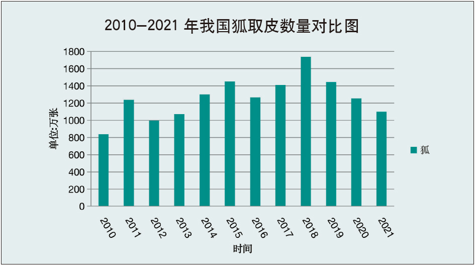 2021年中國狐取皮數(shù)量1100萬張左右,與2020年統(tǒng)計(jì)數(shù)量相比減少了12.21%。從2010年到2021年取皮數(shù)量情況看,2018年以前整體呈起伏狀態(tài),2018年取皮數(shù)量達(dá)到頂峰,2018年以后出現(xiàn)連續(xù)下滑。2010-2021年中國狐取皮數(shù)量對(duì)比圖如下: