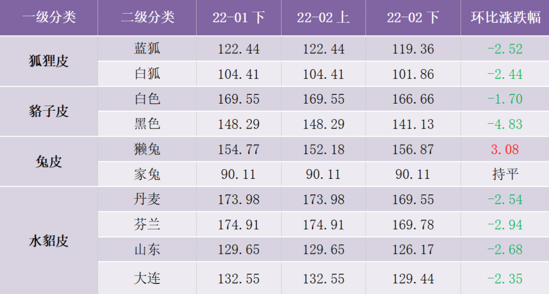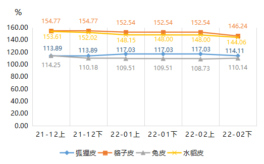 2022年2月下半月,分品類產品價格指數(shù)漲跌各異,其中貉子皮產品價格指數(shù)下跌較大,2月價格指數(shù)收報146.24點,環(huán)比下滑4.13%。狐貍皮產品價格指數(shù)近三個月首次出現(xiàn)下跌,2月下半月指數(shù)收報114.11點,環(huán)比跌幅為2.50%。水貂皮產品價格指數(shù)2月下半月收報144.06點,相比上期下滑2.66%。兔皮產品價格指數(shù)則有上漲,2月下半月收報110.14點,環(huán)比漲幅為1.30%。2022年2月下半月,裘皮各品類細分產品價格指數(shù)中,除獺兔皮產品價格指數(shù)外普遍下跌。具體價格指數(shù)運行情況如表所示: