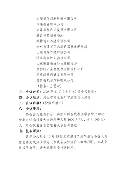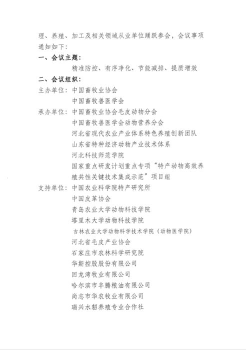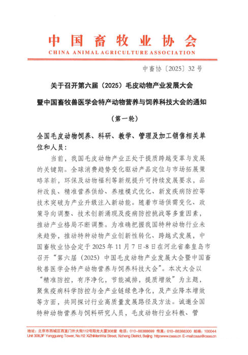 關(guān)于召開第六屆(2025)毛皮動(dòng)物產(chǎn)業(yè)發(fā)展大會(huì)暨中國(guó)畜牧獸醫(yī)學(xué)會(huì)特產(chǎn)動(dòng)物營(yíng)養(yǎng)與飼養(yǎng)科技大會(huì)的通知
