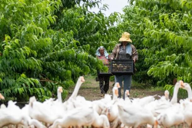 傳統(tǒng)的果園管理中,除草、除蟲和施肥需要大量人力和物力投入,而這種在果園里放養(yǎng)家禽的生態(tài)養(yǎng)殖模式不僅為果農(nóng)們帶來了顯著的經(jīng)濟(jì)效益,還產(chǎn)生了良好的生態(tài)效益。禽類以雜草和昆蟲為食,控制了果園內(nèi)的雜草和害蟲數(shù)量,有效地減少了農(nóng)藥和化肥的使用量。同時(shí),它們的糞便又成為了桃樹生長的寶貴肥料,提高了土壤肥力,促進(jìn)了桃樹的生長和果實(shí)的品質(zhì)提升;禽類的肉和蛋類又可出售,為果農(nóng)們帶來了額外的經(jīng)濟(jì)收入。(本文有刪節(jié))
