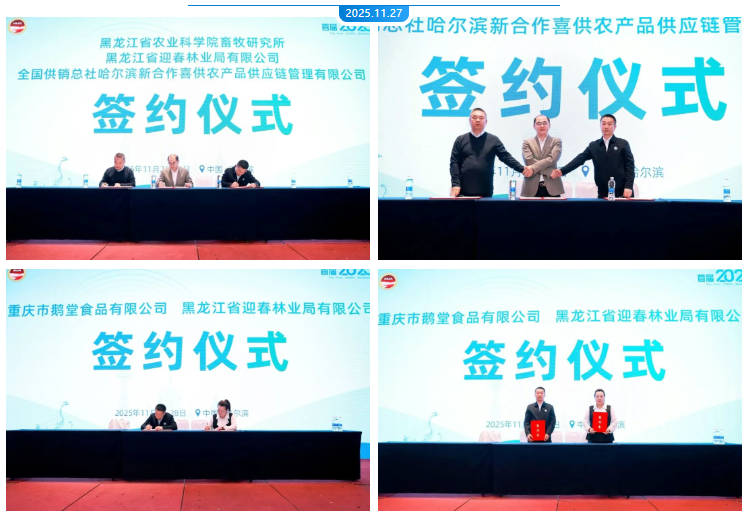 開幕式后舉行了簽約儀式。黑龍江省農(nóng)業(yè)科學(xué)院畜牧研究所、哈爾濱新合作喜供農(nóng)產(chǎn)品供應(yīng)鏈管理有限公司與黑龍江省迎春林業(yè)局達(dá)成合作;重慶市鵝堂食品有限公司也與黑龍江省迎春林業(yè)局有限公司完成簽約,展現(xiàn)了強(qiáng)強(qiáng)聯(lián)合、深化產(chǎn)業(yè)協(xié)作的趨勢(shì)。