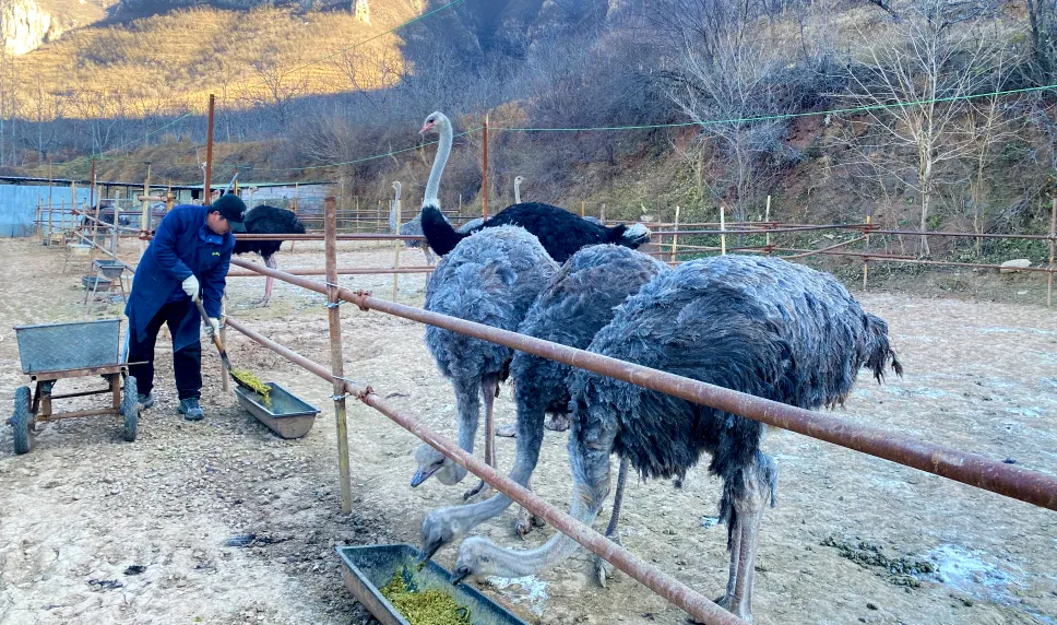 涉縣騰源鴕鳥養(yǎng)殖場負(fù)責(zé)人 楊振國:“今年是我返鄉(xiāng)養(yǎng)鴕鳥的第三年,咱石門村地處太行山區(qū),干燥向陽的地理位置和生態(tài)環(huán)境,特別適配鴕鳥生長。地里的玉米秸稈、紅薯藤還有各種菜葉,都能當(dāng)飼料,大大節(jié)省了養(yǎng)殖成本。”
